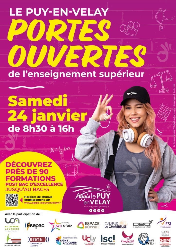 Les établissements de l’enseignement supérieur du Puy-en-Velay et du bassin ponot ouvrent leurs portes samedi 24 janvier prochain ! L’occasion rêvée pour découvrir les presque 90 formations post BAC dispensées ici, au cœur de la Haute-Loire.